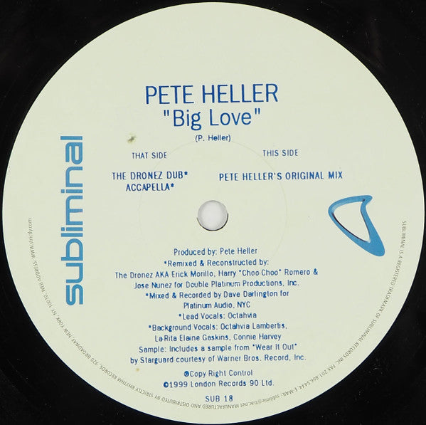Comes in a generic white spined Subliminal sleeve, with a red sticker wrapped over the sleeve's opening. This sticker contains the artist, the title, and release notes on the front, and the barcode and catalogue number on the back. The company responsible for phonographic copyright (℗) is credited as "London Records 9 Ltd.". Release Pete Heller's Big Love* – Big Love suggests that this is a typo, hence the reference to "London Records 90 Ltd.". Runout info is hand-etched. Release Notes (excerpt, located on front section of the sleeve's sticker): Remixed for Platinum Productions Inc. Release Notes (excerpt, located on the label of side A): Includes a sample from "Wear It Out" by Starguard.